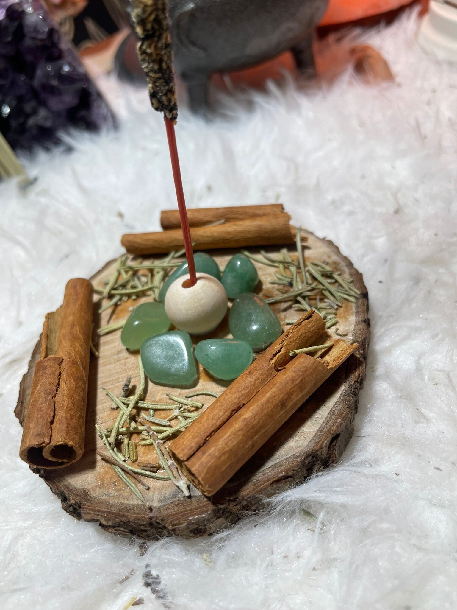 Eleva la energía de tu hogar con nuestro Porta Incienso Artesano, un objeto creado a partir de tronco de madera natural e imbuido con los poderosos elementos de aventurina verde, canela y romero. Este porta incienso no solo sirve para sostener tus varillas de incienso, sino que actúa como un talismán de prosperidad, protección y purificación.