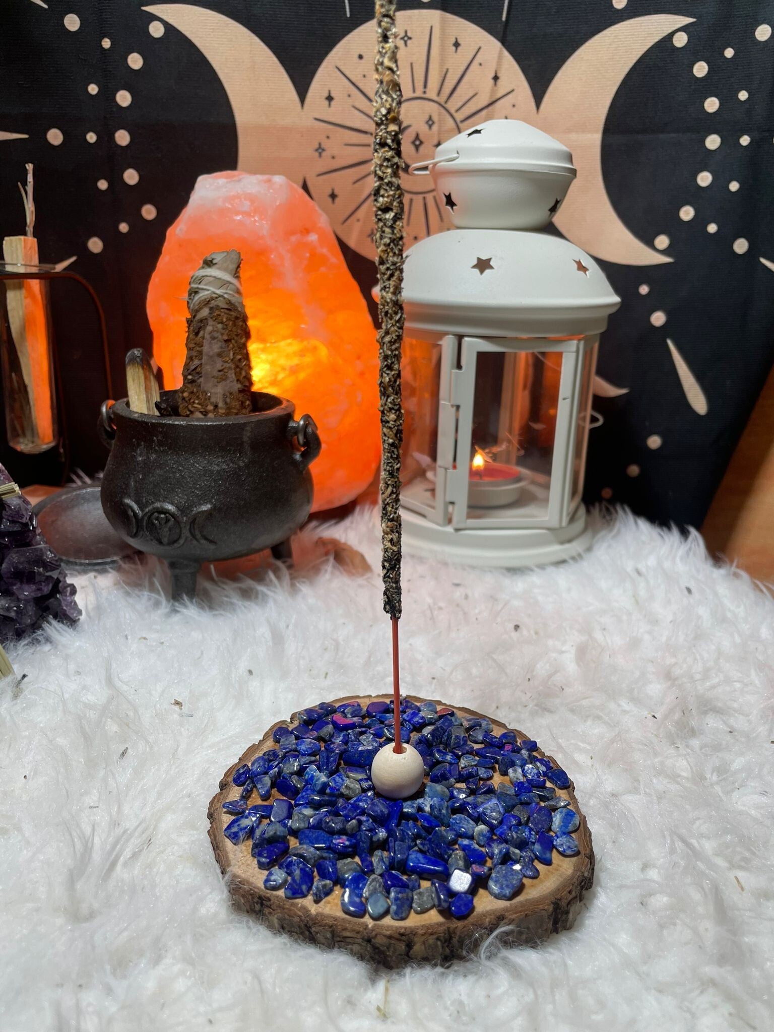 Nuestro porta incienso artesano no solo es funcional, sino que también es un objeto de arte que añade un toque de elegancia y significado a cualquier espacio. La pieza de lapislázuli incrustada en el tronco de madera no solo embellece el objeto, sino que también infunde en tu hogar una energía calmante y protectora.