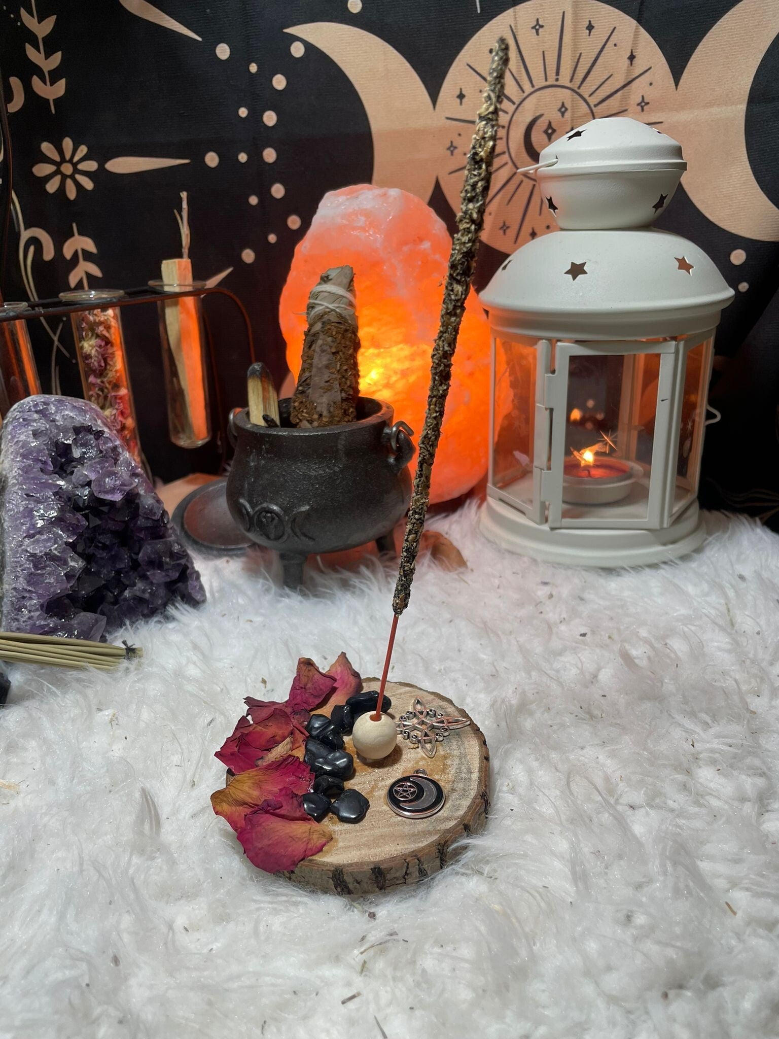 Porta Incienso Artesano con Obsidiana Negra, Pétalos de Rosa, Nudo de Brujas y Luna con Pentagrama