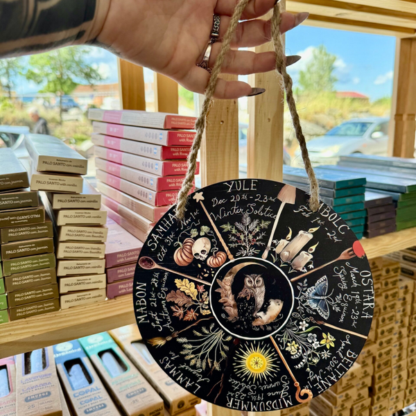 Esta rueda mágica de madera negra, ilustrada con símbolos brujiles y las fechas de cada sabbat, es una pieza ideal para brujas que desean vivir en armonía con las estaciones y la energía de la Tierra. En su centro, una lechuza guardiana de los secretos ancestrales te recuerda el poder de seguir el ritmo natural del tiempo sagrado.
